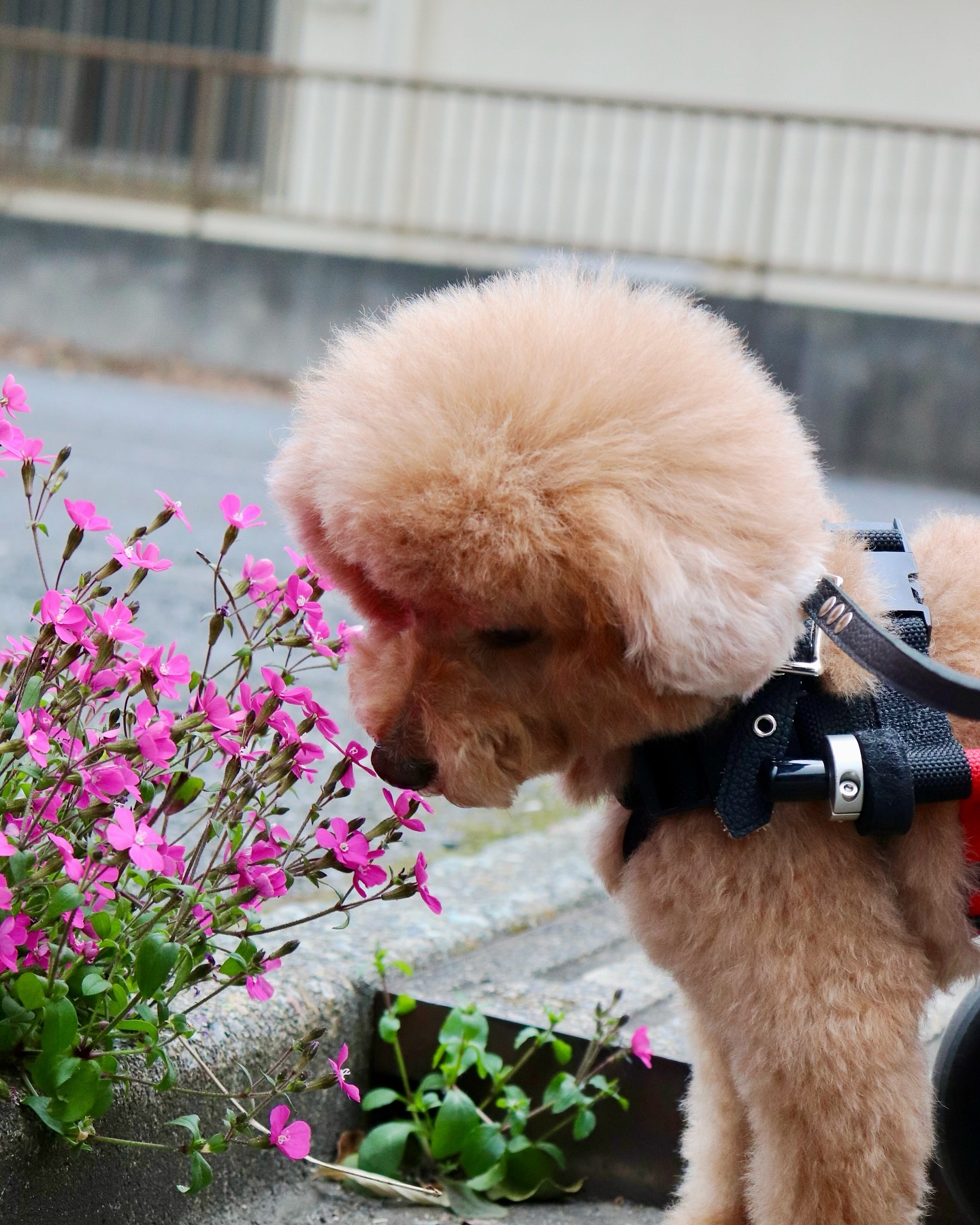 道端のお花にそっと顔を傾けるさくまる
